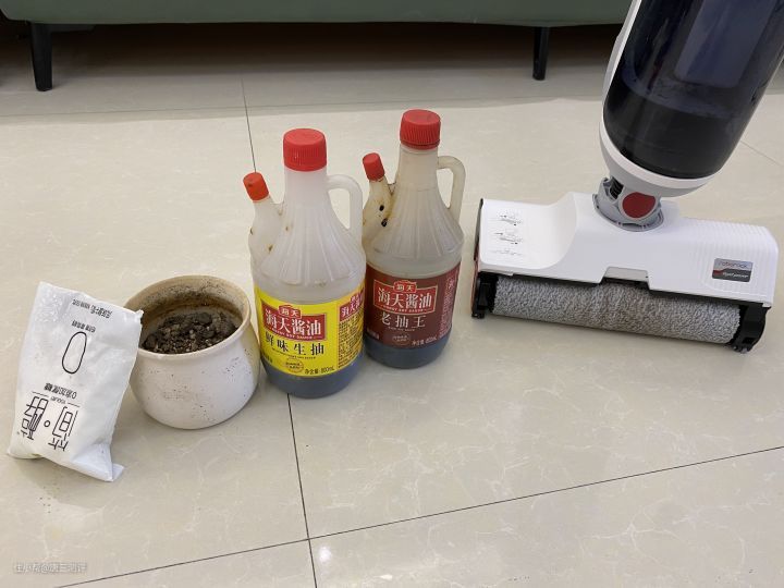 我当时买的时候看了很多款洗地机,发现这一款是双侧沿边设计!两排滚刷巧妙组合,左右都不留缝隙,完成覆盖边边角角,轻松应对复杂环境。比如对于地面清洁,最让人头疼的不过是厨房了,水渍调料油烟哪一样也是不可避免的,下面我暂时选择了生抽(代表浅污渍)老抽(代表重污渍)进行测试,看看roborock洗地机会有什么样的表现。来!!给大家看看清理这些厨房污渍的时候拍的!!!