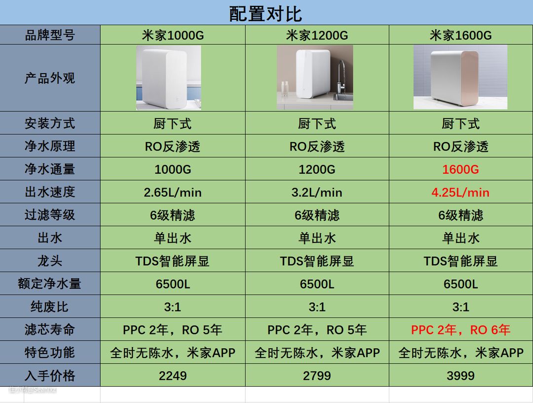 从多年实际体验来说,大通量永远是放在第一位的,尤其是在大量水的需求下,三款的额定净水量基本一致,1600G的RO反渗透滤芯可以达到6年寿命。