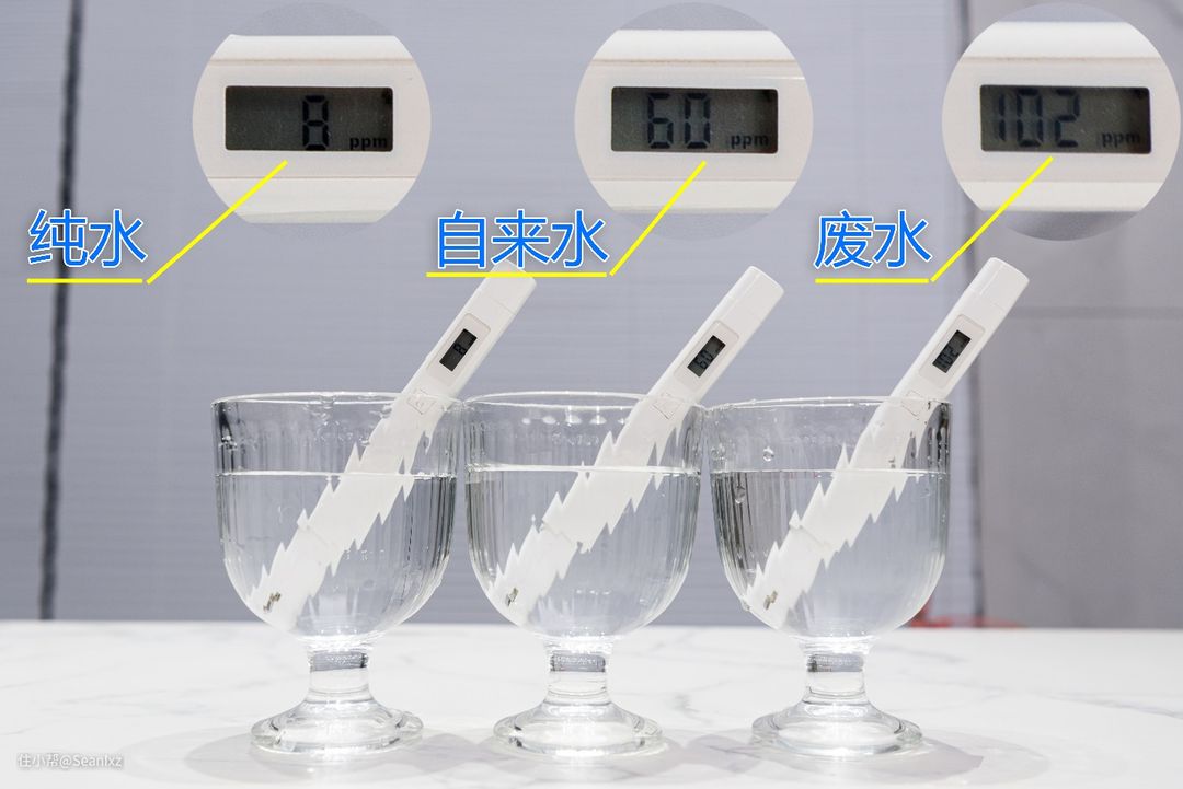 分别接了纯水、自来水、废水使用TDS检测笔测试了水质。