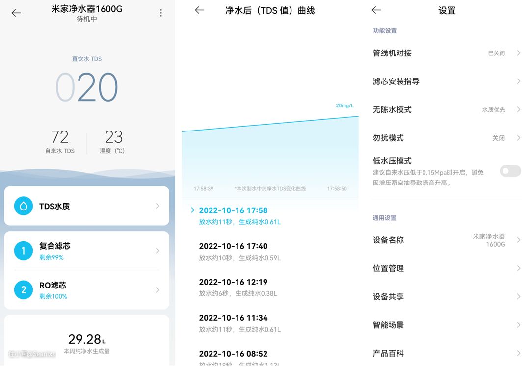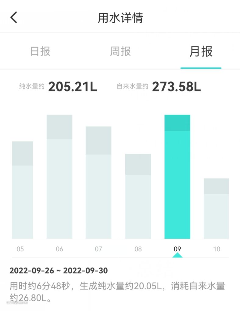 使用米家APP配网后可以查看水质、滤芯使用量等详细信息,甚至精确到每次用水量的使用记录,统计数据非常全面。