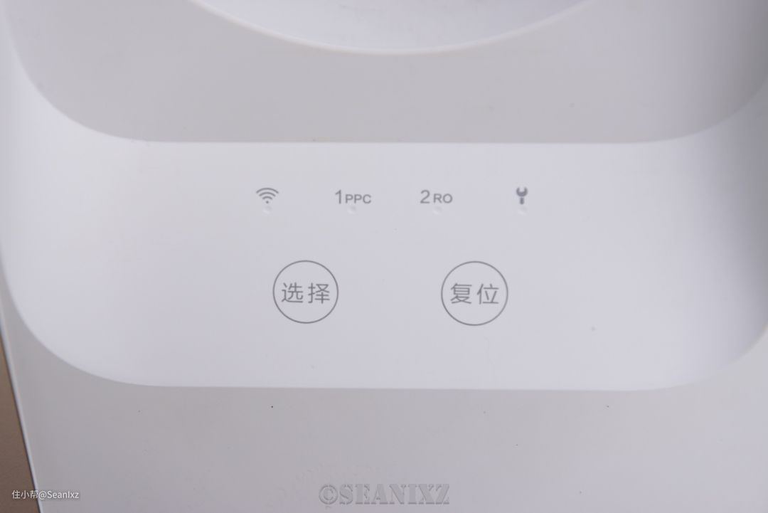 机身信息面板展示在盖子内部的下方,功能简单直观,“选择”按钮切换滤芯选项,长安复位重置,同时长按7秒进入配网模式。