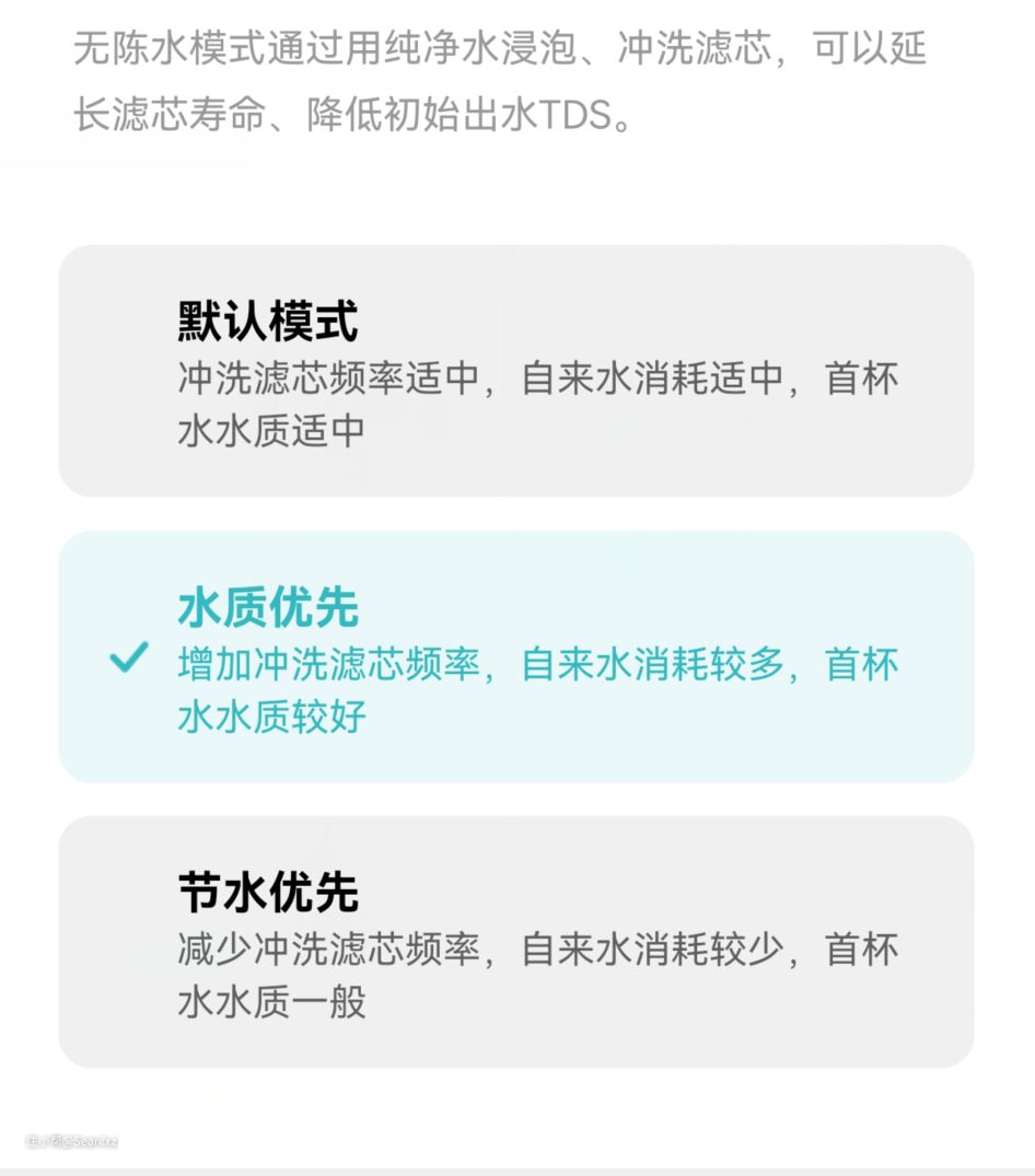 无陈水模式实际上就是以一定的时间自动进行冲洗减少纯水端的浓度,提升头杯水的水质,实现真正意义上的任何时候都是可直饮的体验,自来水不是很贵的话建议开启水质模式提升体验。