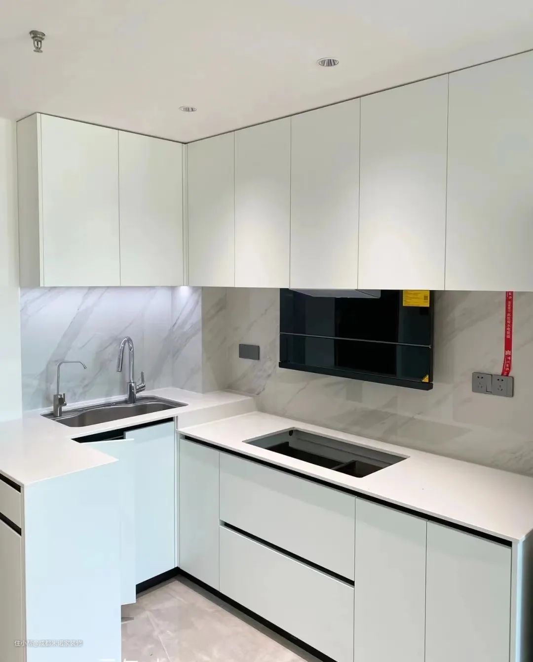 L型布局适用于以墙角为中心规划的厨房,灶台、水槽分别都靠墙,将动线双向展开。这种布局很适合做高低台,可以刚好将台面做成两个高度,在拐角的地方做区分。