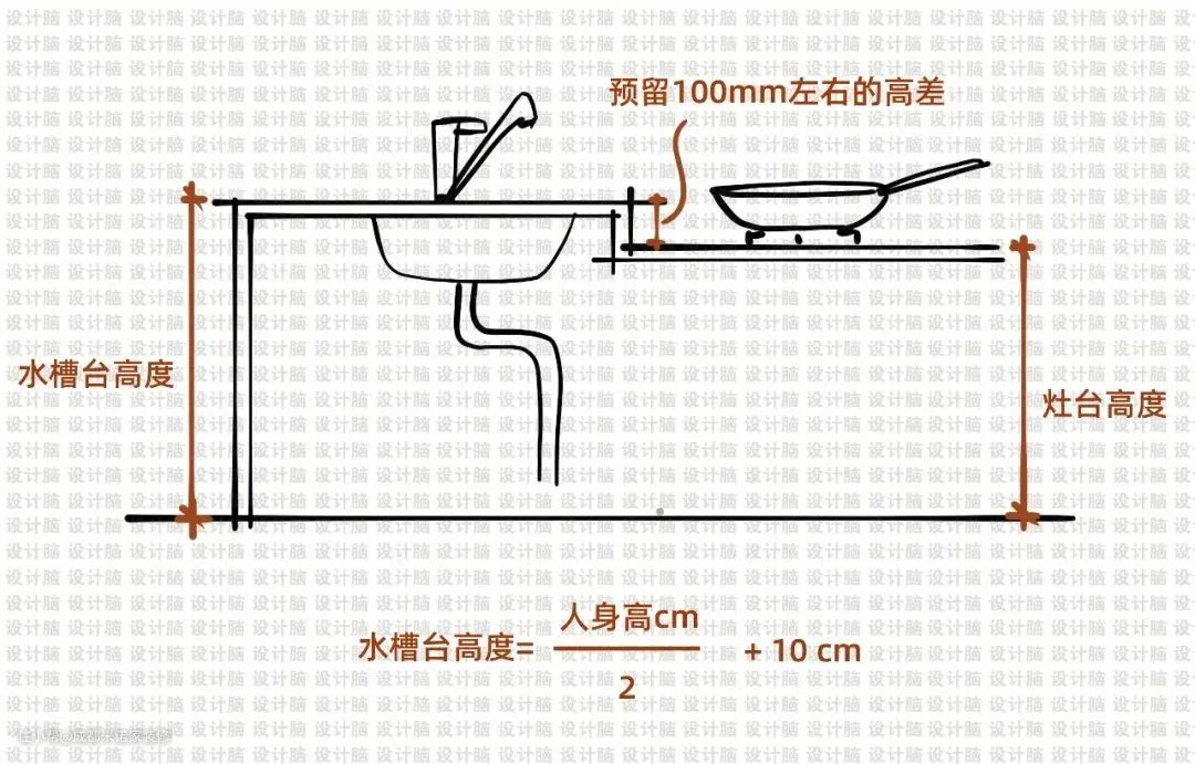 一般情况下,应该根据家里经常下厨的人的身高,来设置操作台的高度。具体高度可参考下图的公式:水槽台高度=身高(cm)/2+10(cm)