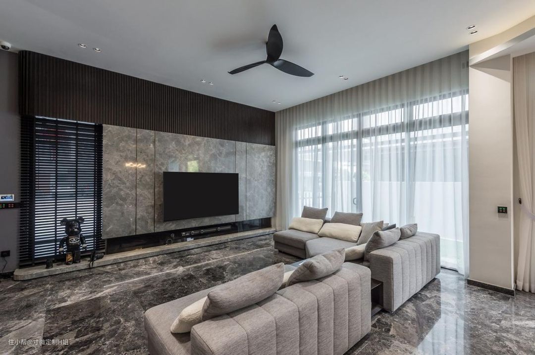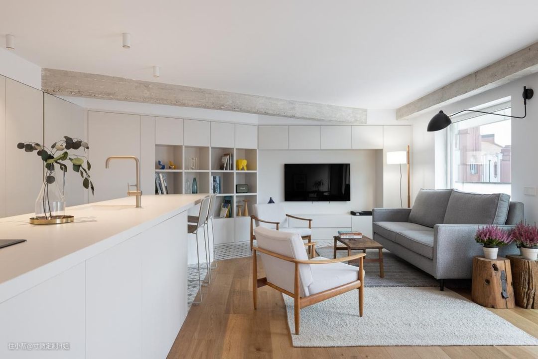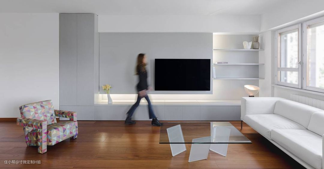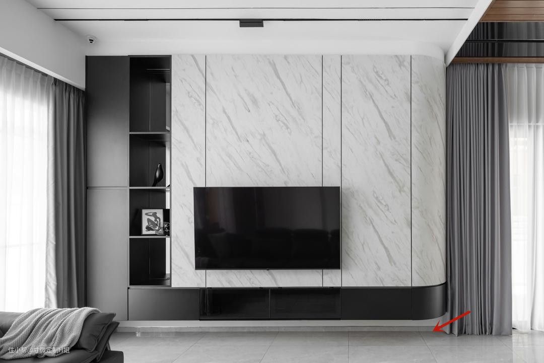 如果电视旁边有个门,则可以考虑隐形门、收纳柜的一体化设计,从视觉上让客厅显得更大、更宽敞。