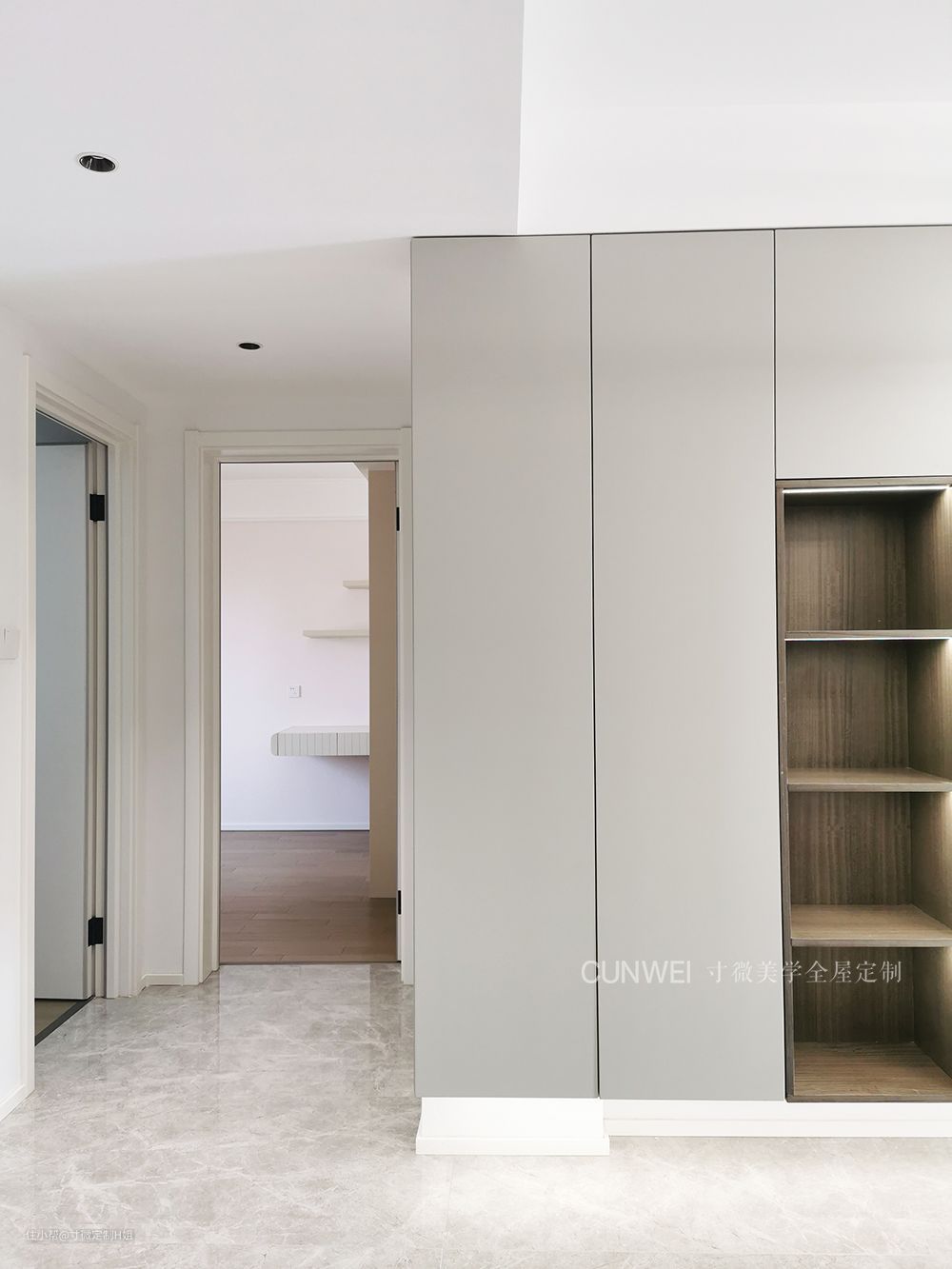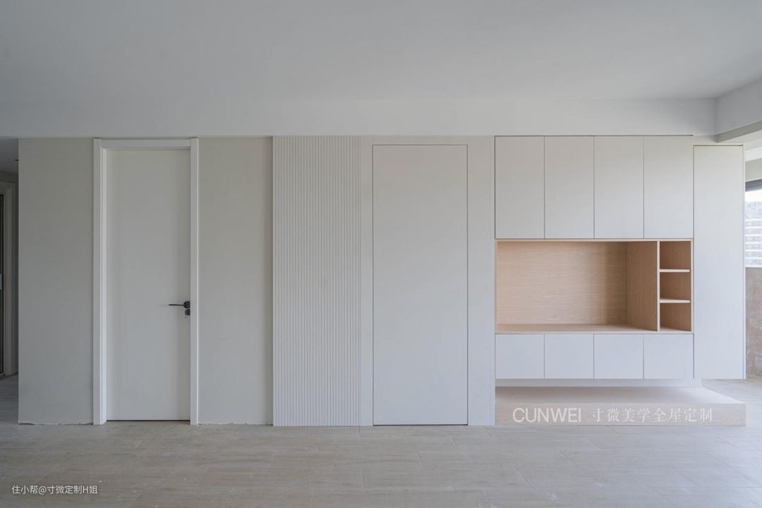 害怕大面积收纳柜会显得空间厚重、压抑的,也可以考虑采用“留白”的设计,根据不同的情况,在定制收纳柜时局部留空,让柜体更有“轻盈感”。
