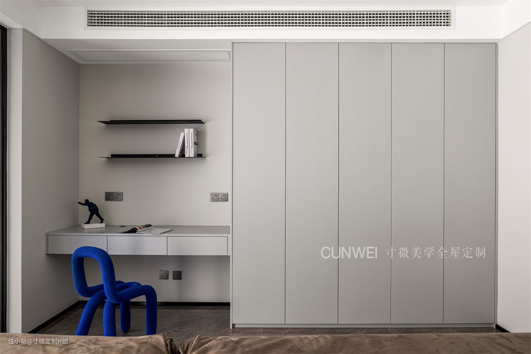 沙发不靠墙,装一整面收纳柜也是个不错的选择,再延伸出书桌,同时满足收纳、学习的不同生活需求。