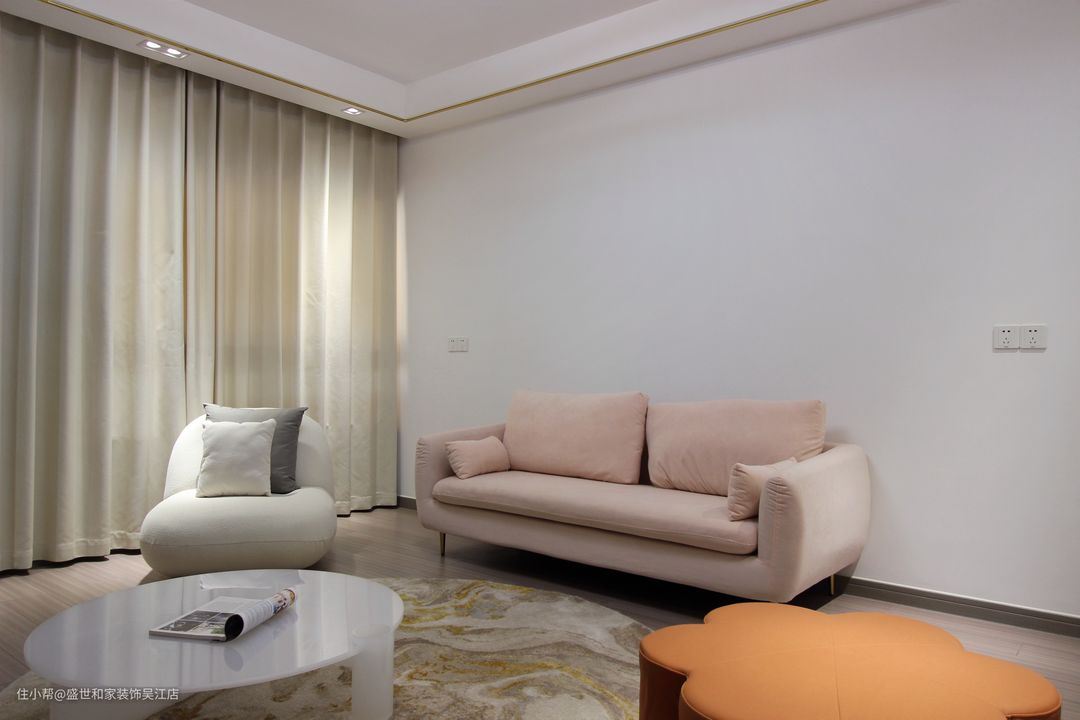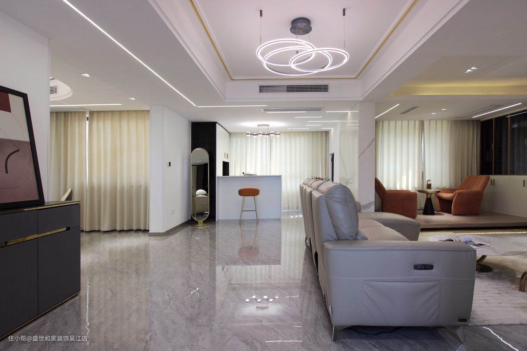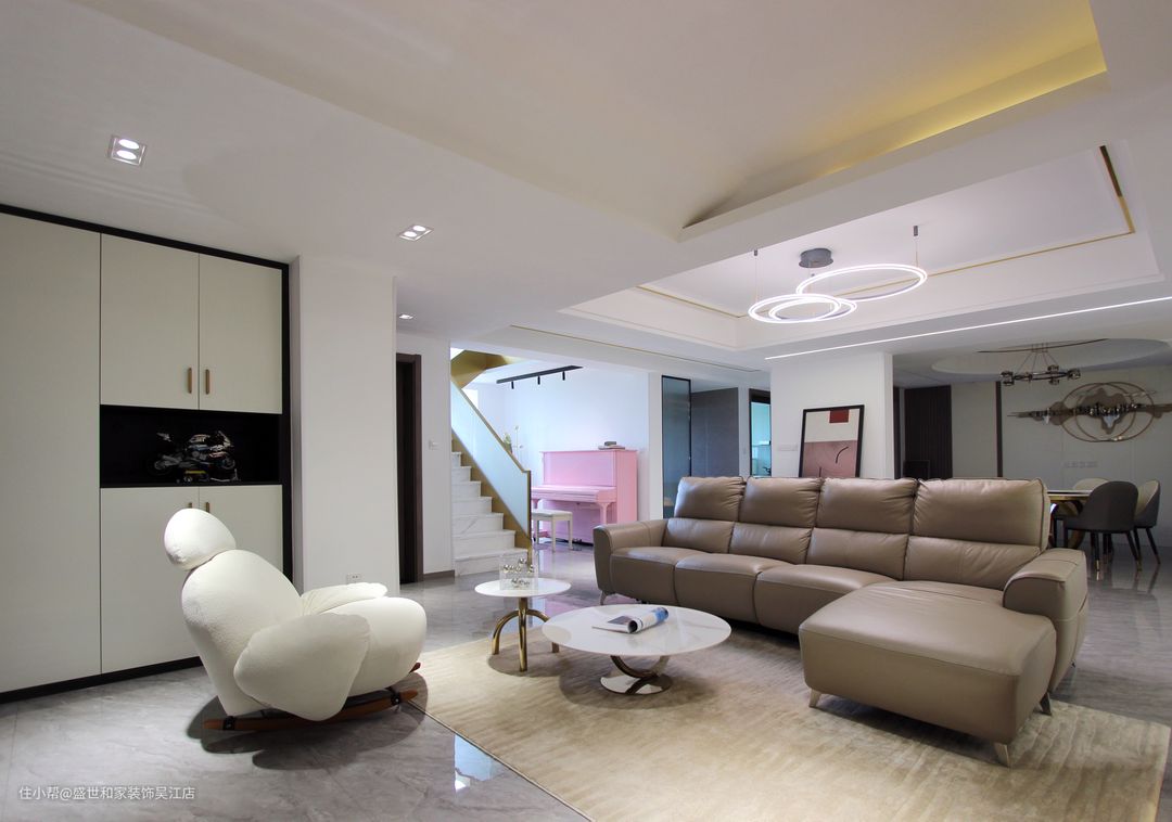 客厅左侧抬高地台做休闲区,上方内嵌灯带可以起到辅助照明的作用。从远处看地台会营造出“悬浮”的效果,让空间兼具层次感和设计感。