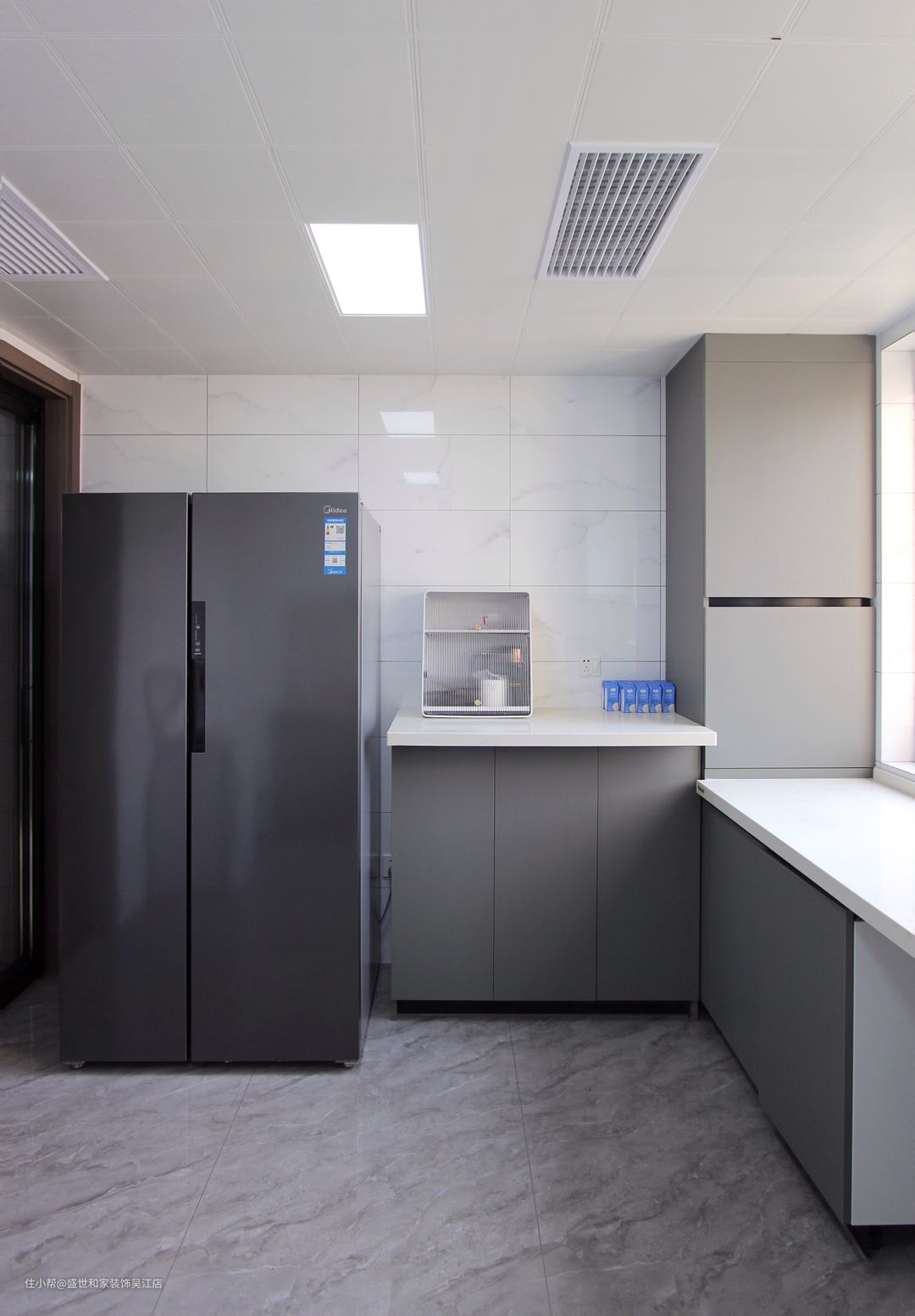 厨房采用U型设计,冷藏区、操作台、洗菜区、炒菜区,动线流畅,使用起来更顺手。预留位置摆放冰箱,节省厨房空间,更加美观简洁。