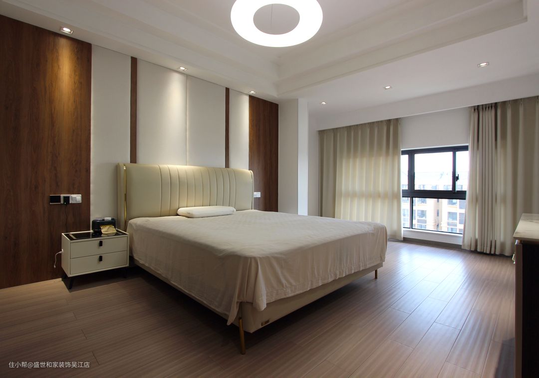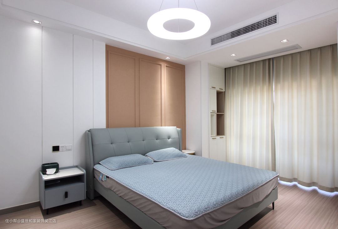 主卧的打造以静谧舒适为主,让居者沉浸在温馨氛围中。顶部筒灯映照在背景墙上,彰显别具一格的空间层次感。
