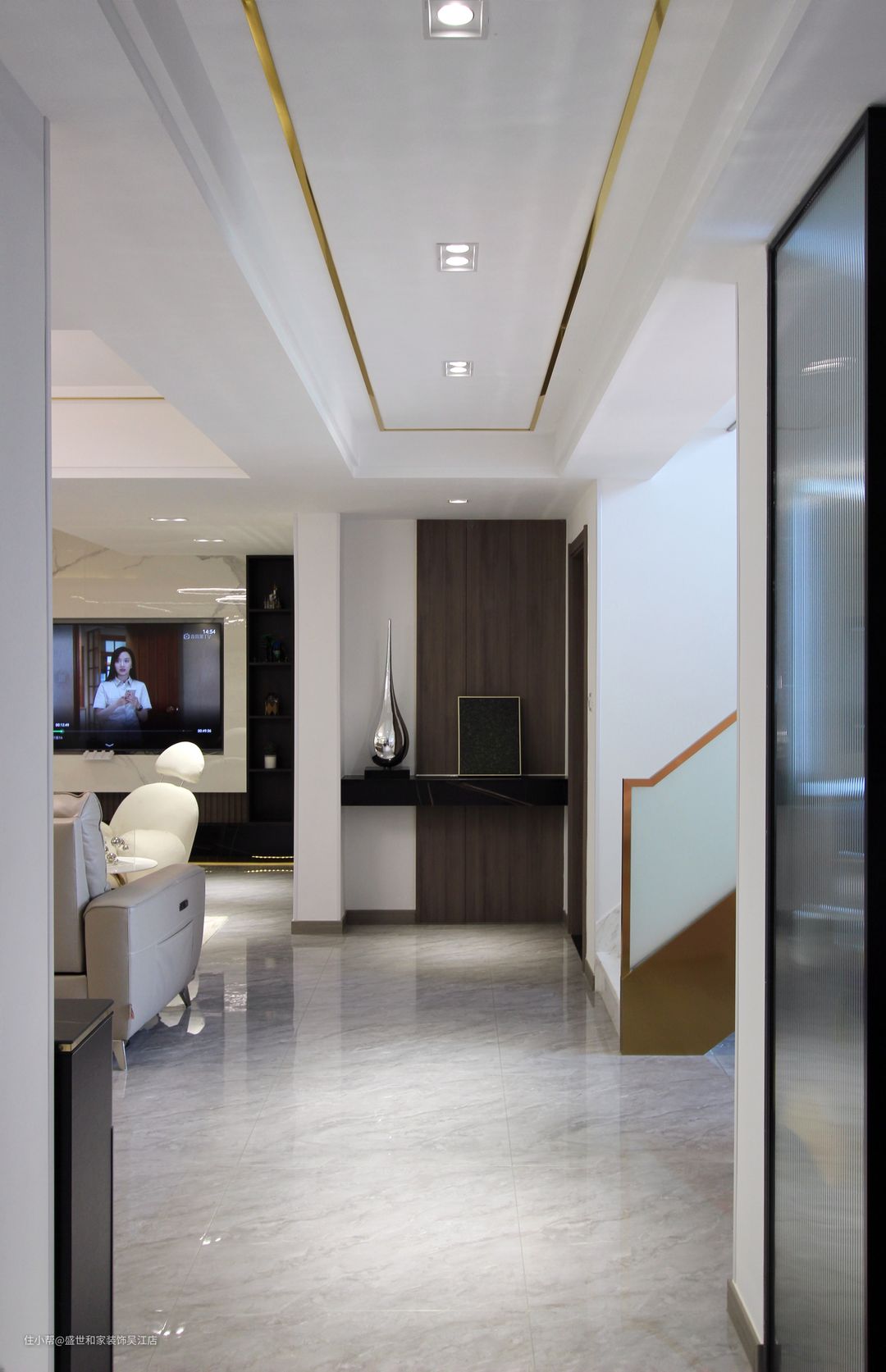 过道空间顶部同样采用金属装饰线条,让吊顶显得更加雅致层次。安装筒灯,通过均匀的照明让整个空间显得明亮宽敞。