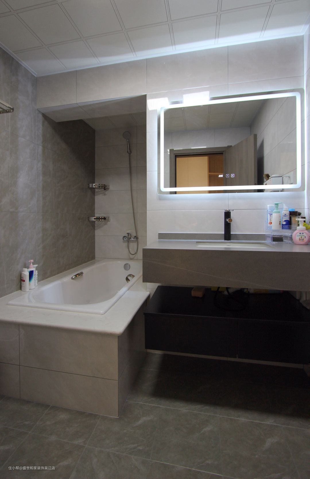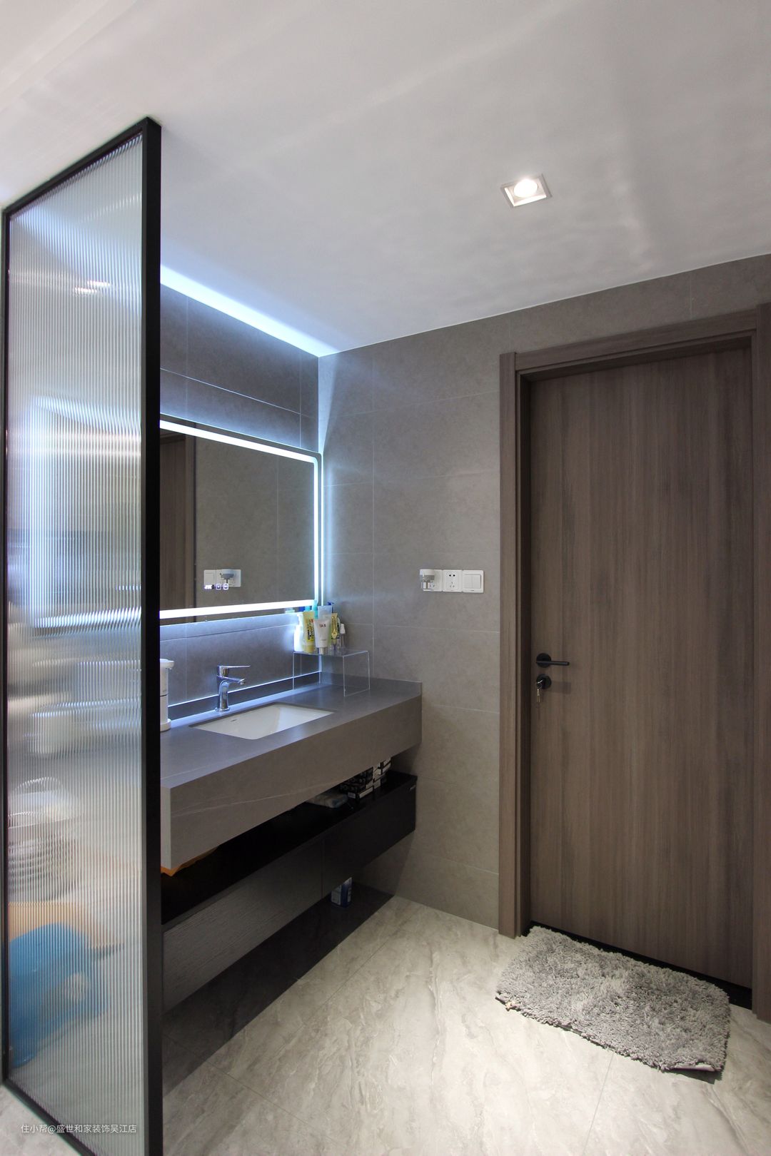 内卫空间通铺灰色瓷砖,耐脏易清洁。上方安装智能LED浴镜,智能补光,无极调光,镜享梳妆。下方台面与浴室柜同样采用悬空设计,可以有效避免柜体底部因为湿气或清水清洗而受潮腐坏。