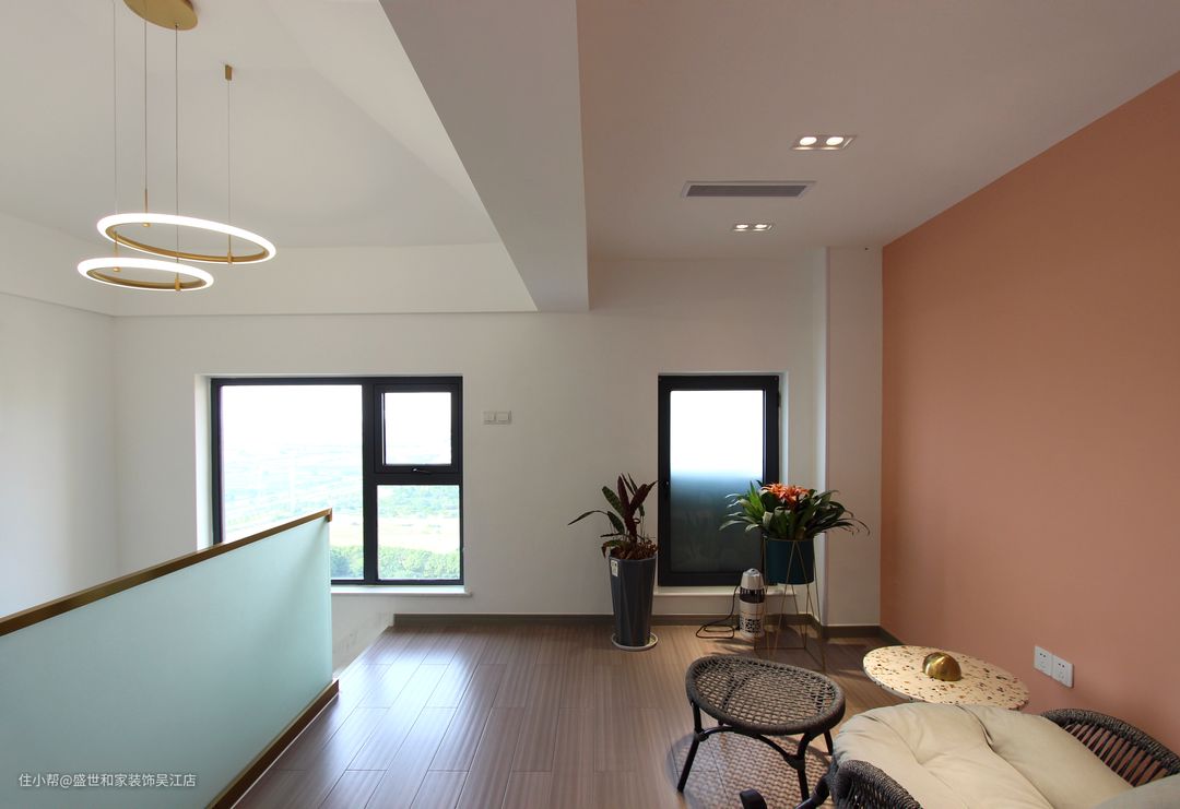 顺着楼梯上到二楼,设计师别出心裁的把过道空间设计作为集休闲娱乐、读书的小天地。