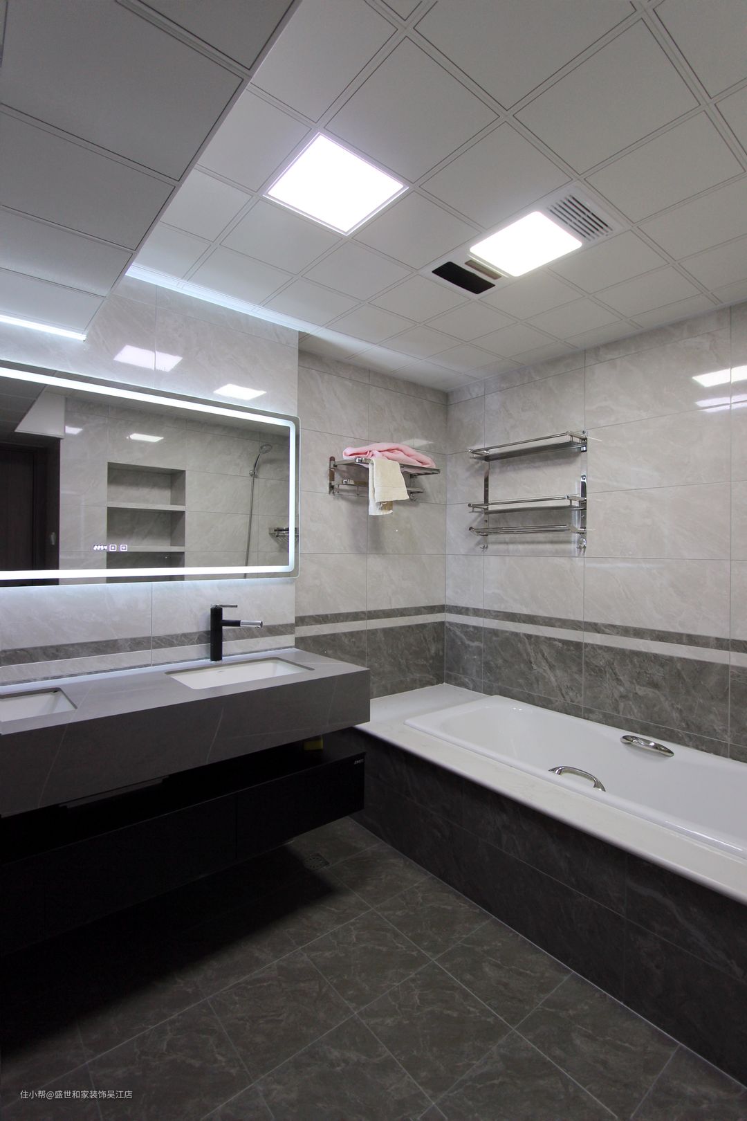 主卫采用双台盆设计,男女业主各自拥有自己的洗浴区,超大镜面使得整个卫生间看起来更大更丰富。淋浴区设计了浴缸+淋浴的组合,非常节省空间。