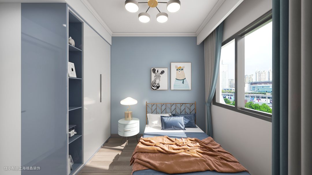 【儿童房】小儿子的房间不大,只容得下张单人床和圆形三脚床头柜。整个空间都是蓝色和白色为主,大衣柜嵌入墙体内,做了一列开放格给孩子放自己喜欢的玩具。床头柜上摆着云朵形状的金属底座台灯,简约有趣。