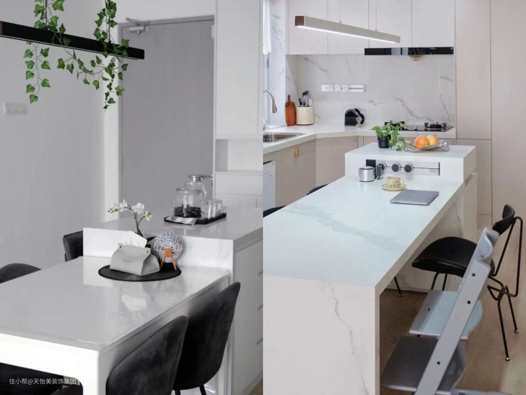现在都流行做开放式厨房,若能结合岛台餐桌一体式,将能节约更多的面积。岛台既可以作为餐桌使用,也可以作为与客厅区的隔断,必要时还能用来备菜放置物品,这样空间也能显得通透,使用更为方便。