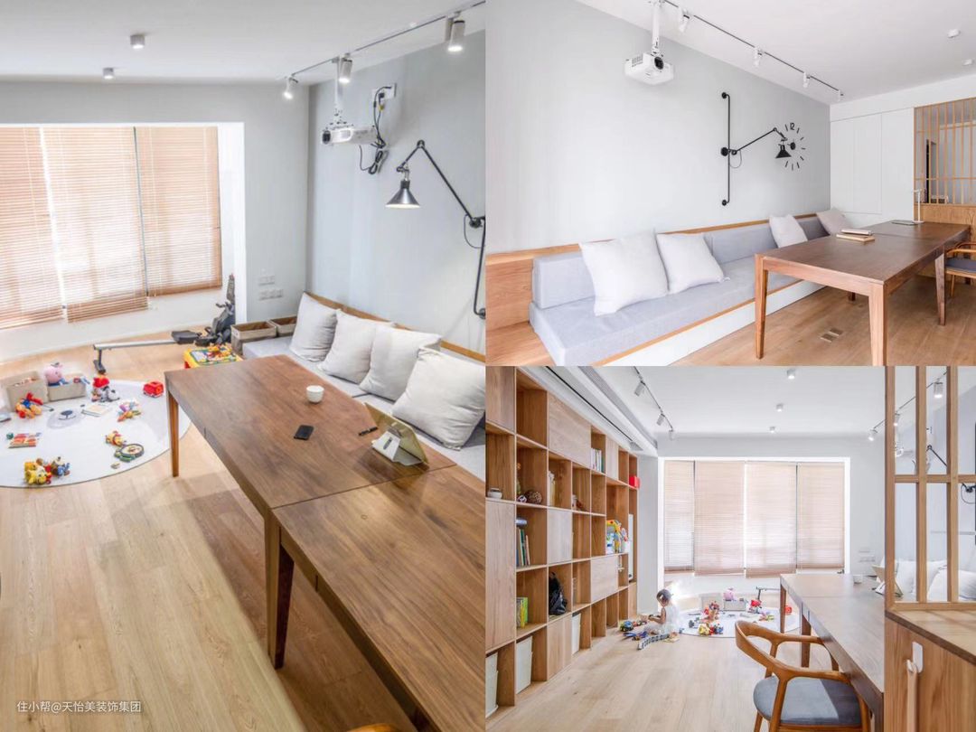 同样,设计是为人居住服务的,如果小户型实在没有餐区位置,也不想搭配伸缩餐桌,那么推荐去电视/沙发化。将原来的客厅区域设计为办公/休闲区域,选用一张大餐桌,墙面用来储物放置书籍,轻松变成就餐、办公、亲子活动区。