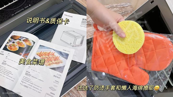 此外,还有抑菌模式、一键烘干,在高温清洁后烘干内胆;机顶上方还有便捷菜单,老板还送上了防烫手套与海绵擦,贴心满满。