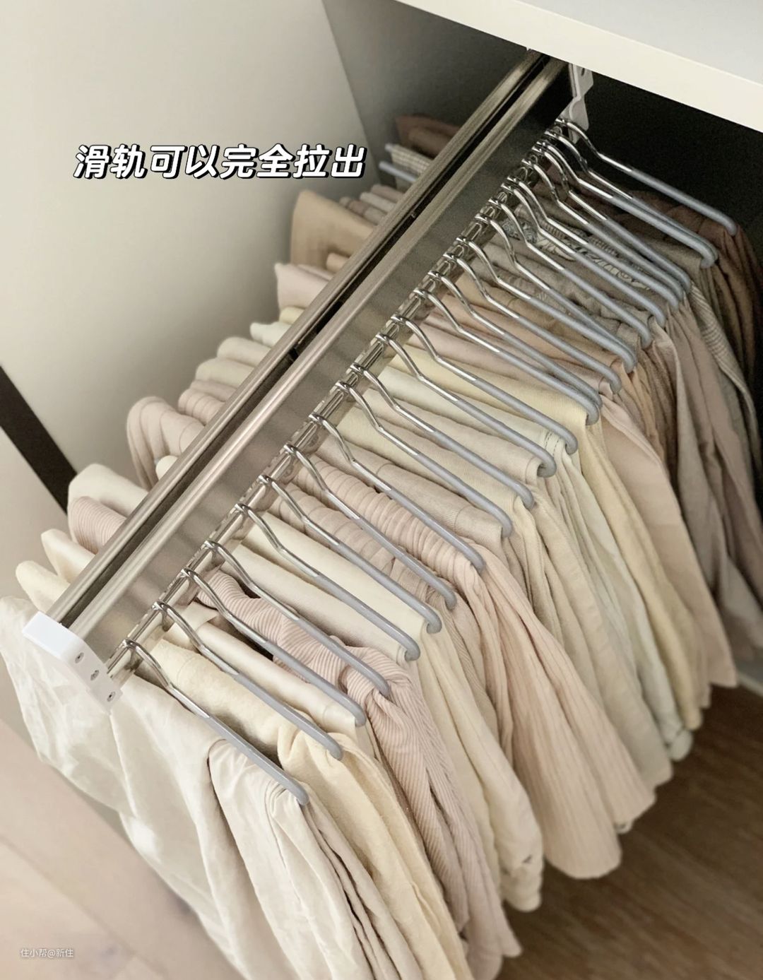 “拉出滑轨,裤子全部出现在眼前,想要那条直接伸手去拿就行,拿完,还不会导致爱他裤子乱掉,太帮了!”这是他的原话。