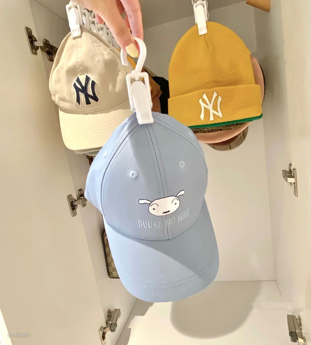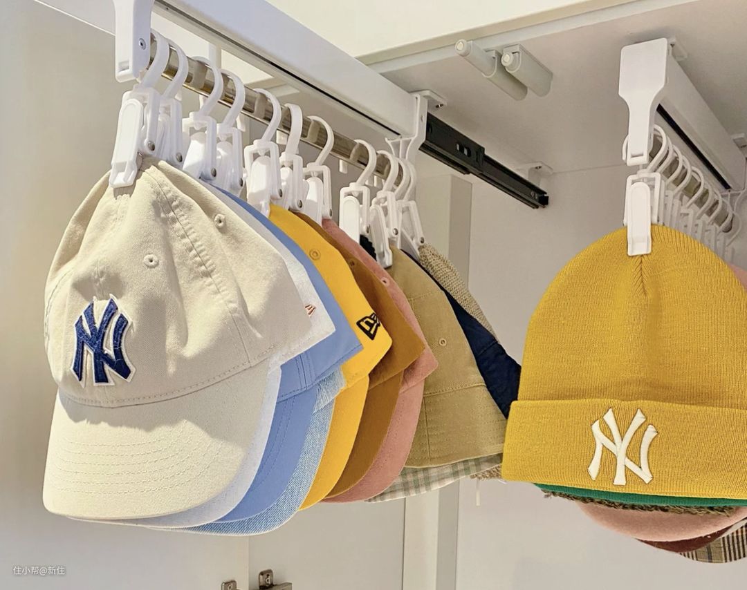 这个方案,其实不仅能用于帽子收纳,衣柜内,还可以用在不太重的短裙收纳上,围巾、领带收纳上等等。