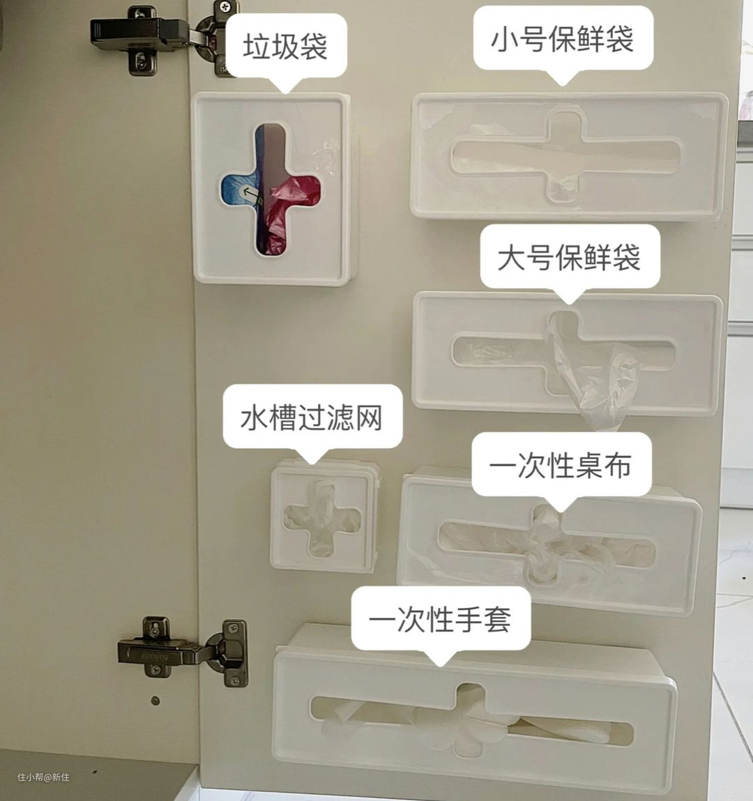 我自己很满意这一点,所以将之贴在厨房的柜门上,用来收纳垃圾袋、保鲜袋、一次性手套、水槽过滤网等厨房小物品,也算是把收纳空间充分利用。