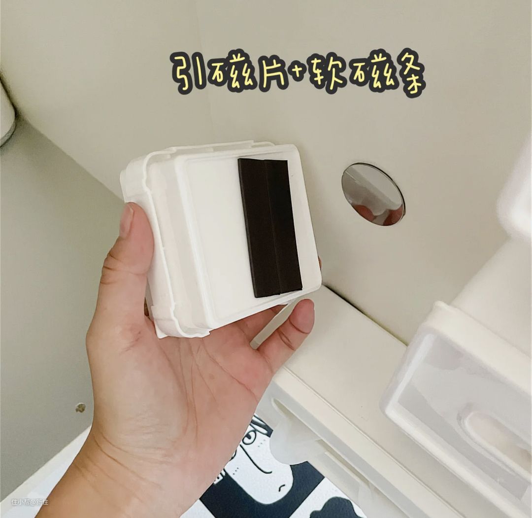 背后是贴的,引磁片+软磁条的,可以随时拿下来,再吸上去。这个东西,很方便哦,也是个收纳神器,能用来收纳遥控、脸盆等等。