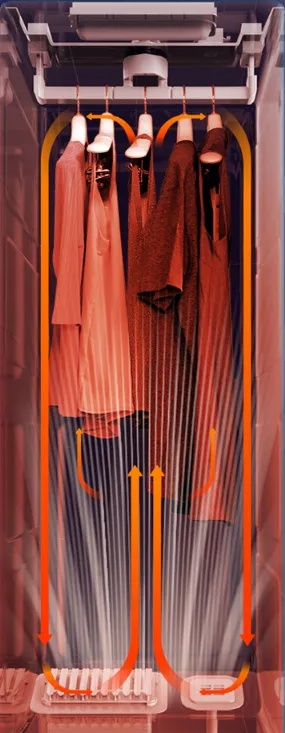 热风型又叫直排型、热风烘干型。简单来说就是通过底部热风系统和蒸汽系统来烘干护理衣物,烘干温度比较高,杀灭螨虫细菌存在一定的优势。作为入门式护理方式,优点是价格比较亲民。