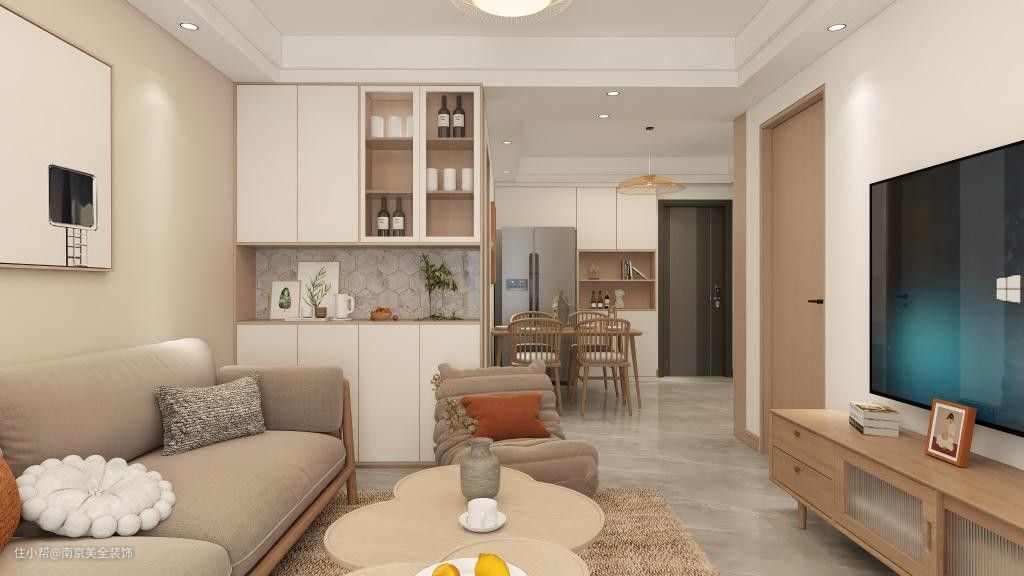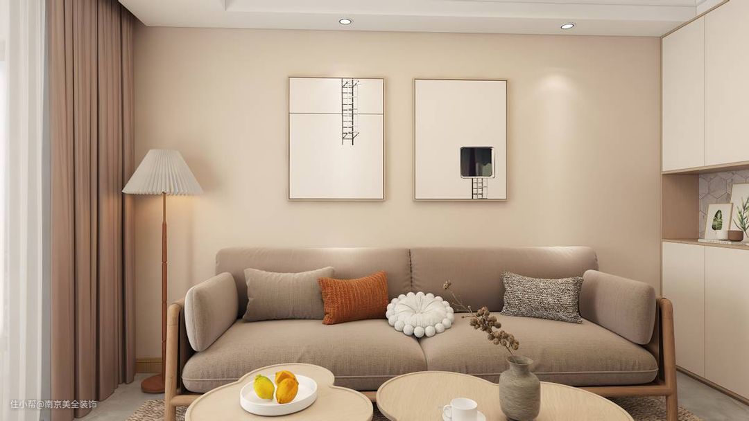 (1)墙面以白色为主,沙发背景墙用了奶咖色让空间色彩有层次感,整体的风格和原木的家具也能够融为一体,沙发墙可以搭配简约的挂画装饰点缀,过多的装饰也会没有设计也要做到留白。