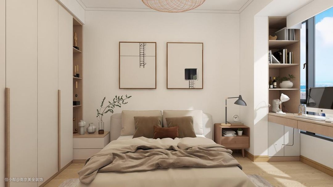 (1)卧室进门有小过道和结构梁,石膏板做了吊顶装筒灯也可以用作夜间的起夜灯,衣柜做了一门到顶衣柜+一体床头柜+开放格的设计起到卧室空间小的尺寸的充分利用。
