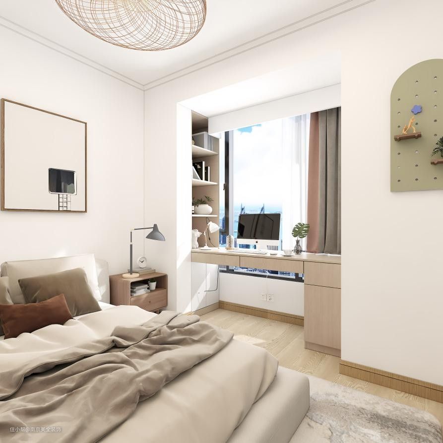 (2)飘窗这里定制一体书桌书柜,台面做了抽屉增加储物空间,颜色的比例穿插搭配也是恰到好处,额外设计了窗帘盒,不会有漏光的问题。
