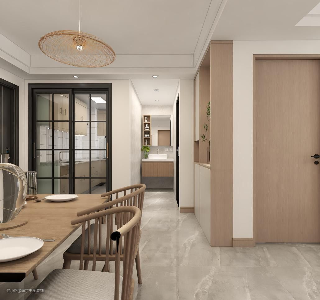 (1)入户是家里的第一道风景,设计讲究一步一景的手笔,本案采用以原木风格,入户做了玄关柜以原木+白色的结合映射家的整体温馨色调。