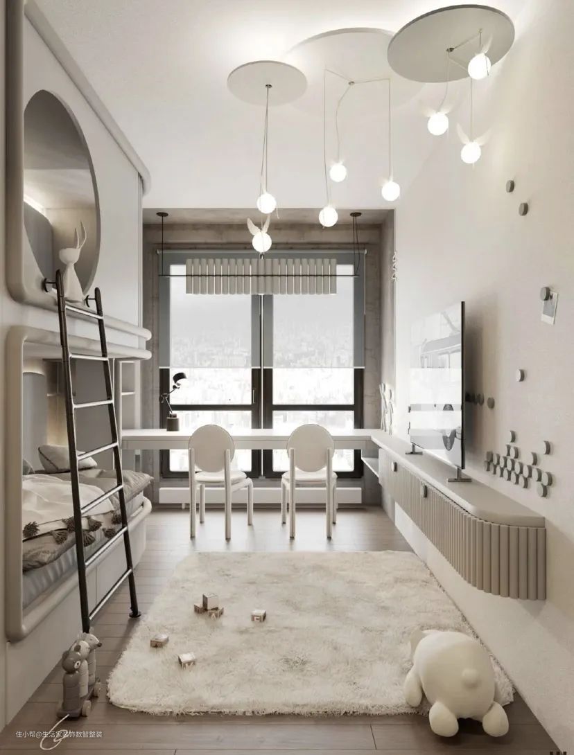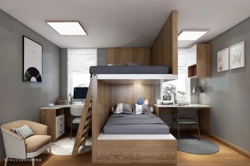 0~12岁时,两个孩子可以共同居住,可以选择双人床,也可以选择上下铺。选择上下铺可以节省空间出来打造一个娱乐区,供孩子玩耍。