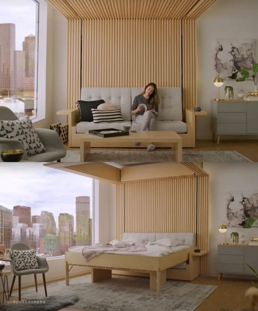 或是利用一些有趣的设计,比如沙发变形床,让客厅在夜晚变成卧室。