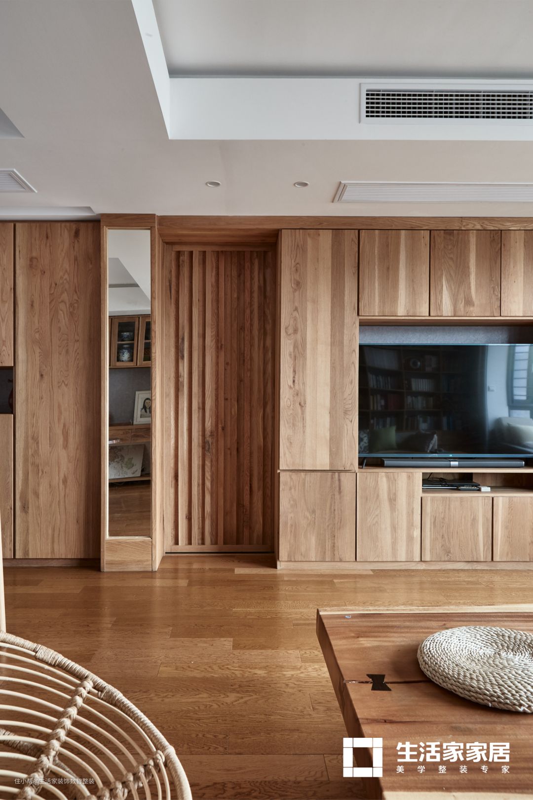 电视背景墙同样以整面实木定制柜为主,统一空间视觉,同时提供了强大的收纳空间