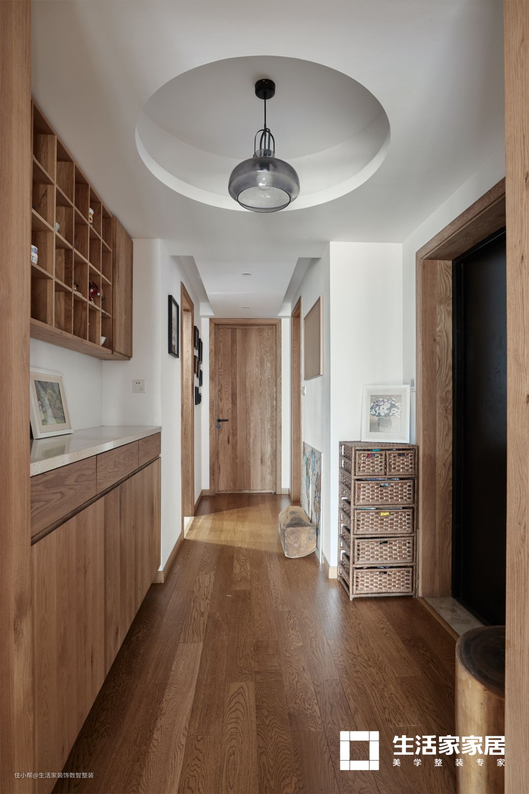 玄关采用延伸设计,加强入户的空间视感,踏进屋就能感受到通透明亮的氛围。玄关柜与鞋柜合二为一,地柜为鞋柜,中间为置物台,吊柜为开放式收纳,业主摆放了自己喜爱的各类瓷器,让入户充满惊喜感。