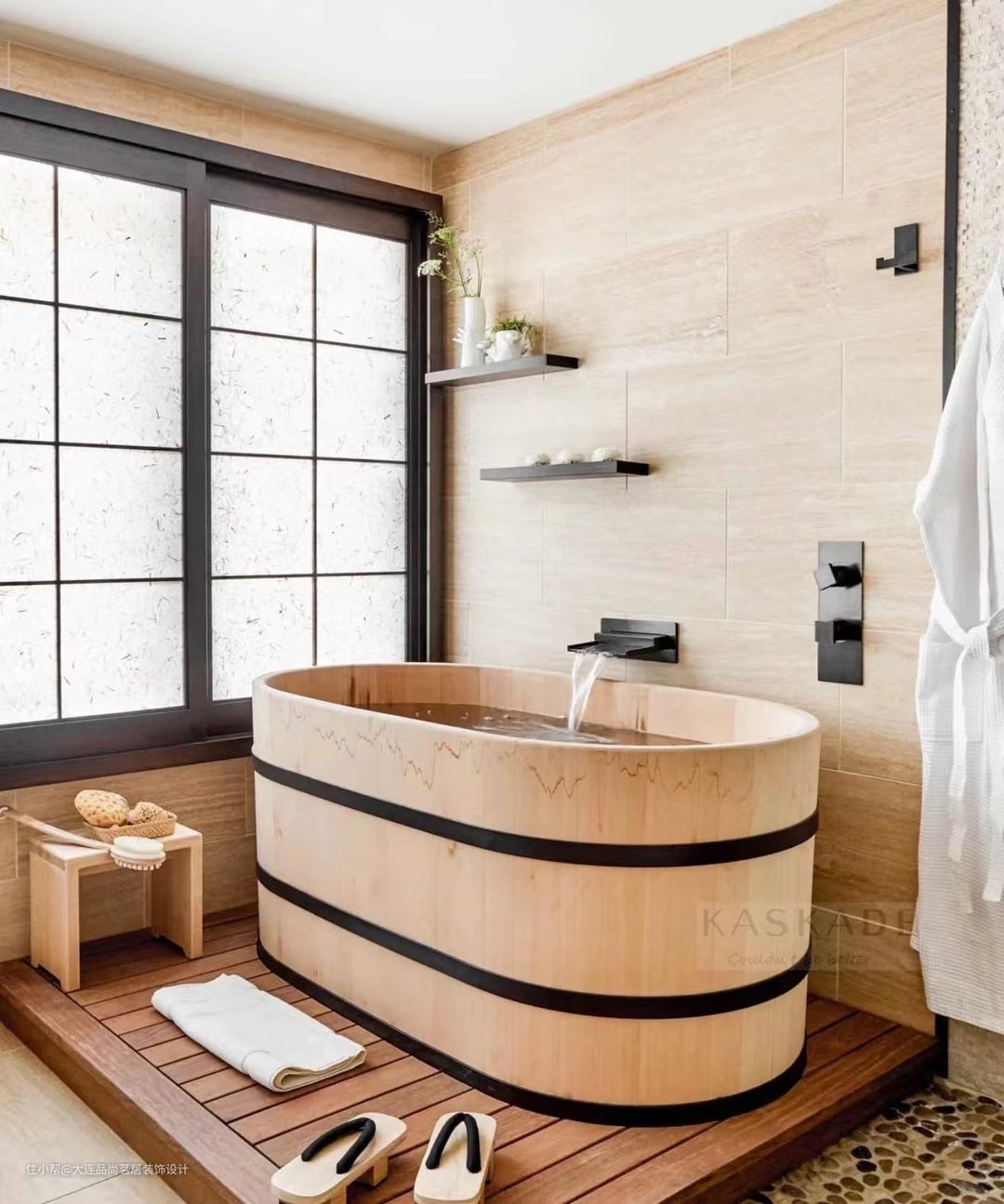 木质浴缸点缀卫生间的确更加自然,有返璞归真的美好感。但是它防潮和耐用性上稍微差一点,需要谨慎选择。