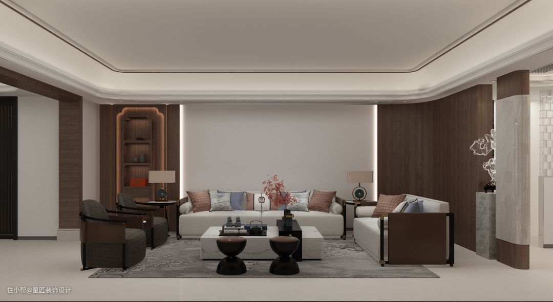 在沙发背景墙上开放柜采用了中式传统的如意纹做为装饰,用线灯点缀,让整体更有韵味不会太过单调