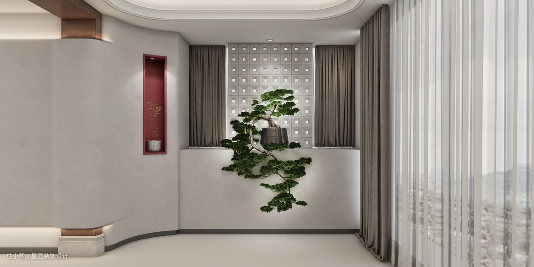 多处使用弧形设计,背景面本身是一整块落地玻璃,坐南向北的朝向,夏天会晒得很热,而镂空砖在遮蔽了大部分光线的情况下,让微光通过,在拉上窗帘的情况下,玄关也不会显得太过暗