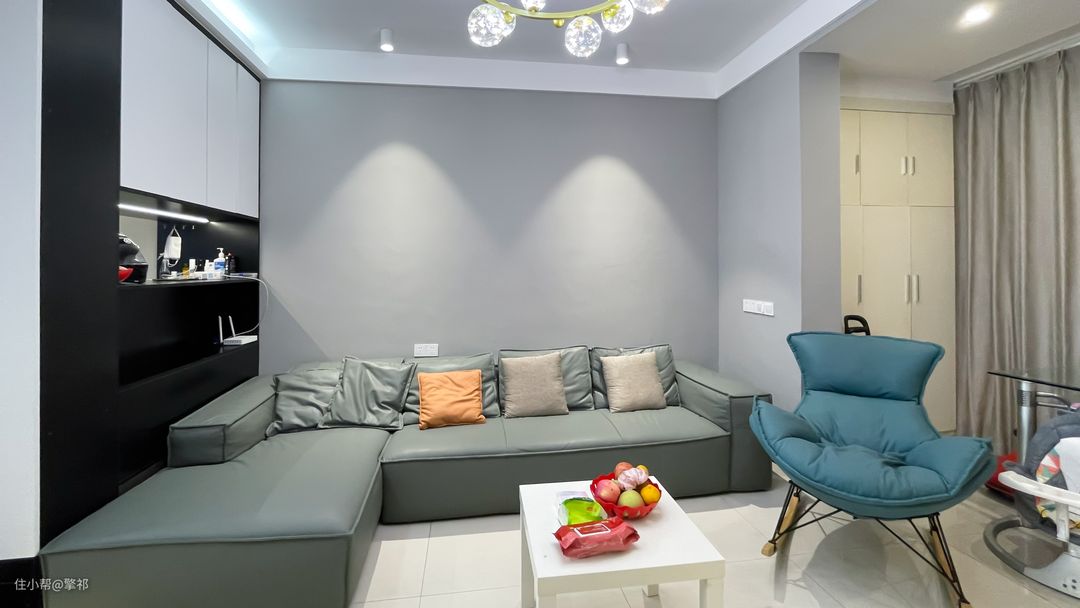 - 电视背景墙采用乳胶漆粉刷,侧面做了吊灯设计,增加了层次感,上方是射灯补光,让新家充满了氛围感。
