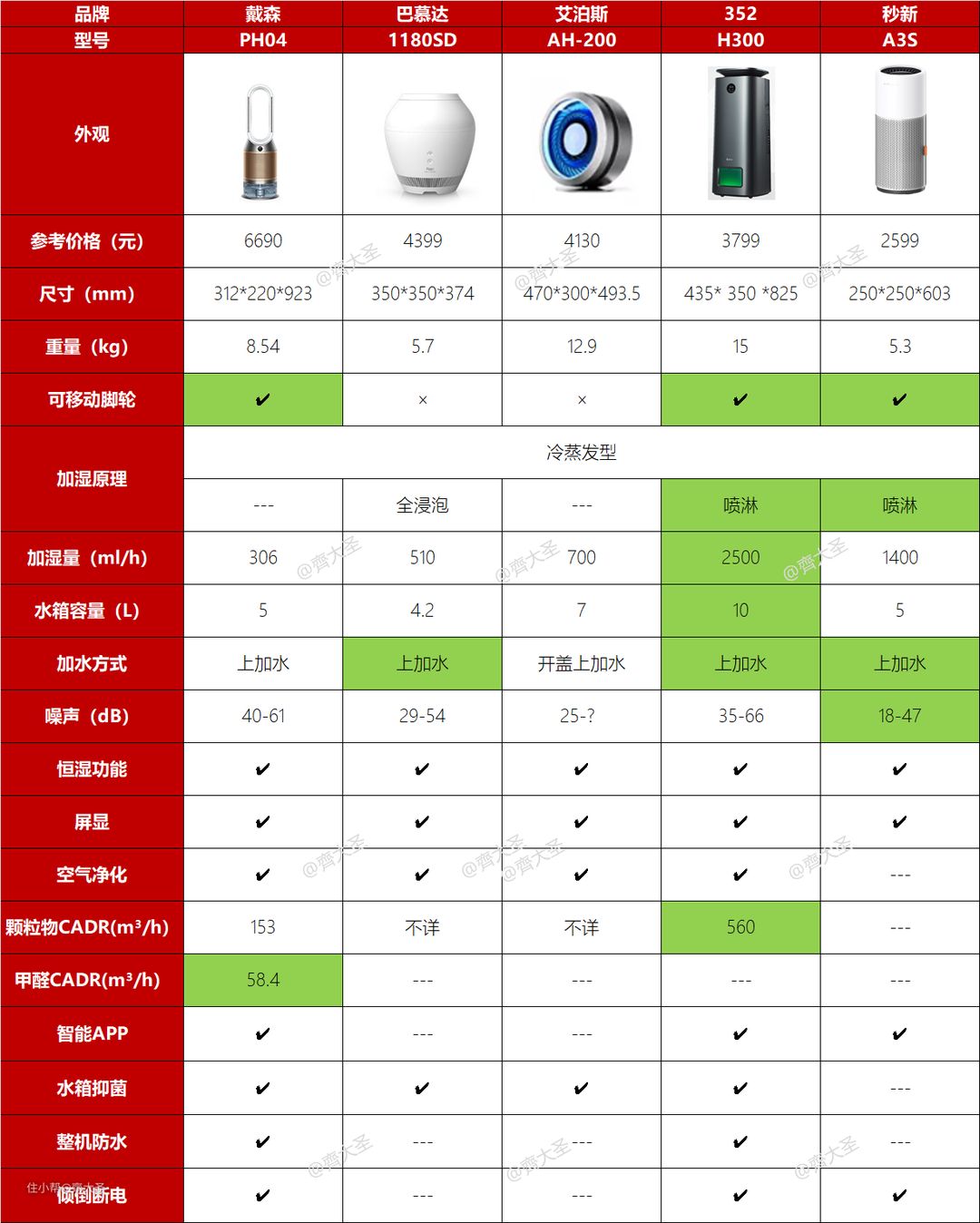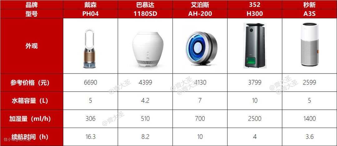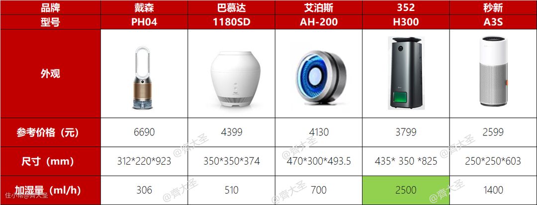 在这一part上,五款产品的差异还真是蛮大的,和价位几乎毫不相关,甚至成反比,价格最贵的戴森加湿量最低,仅为306ml/h,最便宜的秒新A3S,加湿量竟排第二,高达1400ml/h,几乎是戴森的5倍。而加湿量最高的352 H30居然达到了2500ml/h。