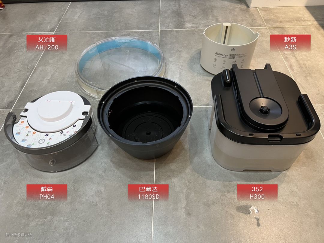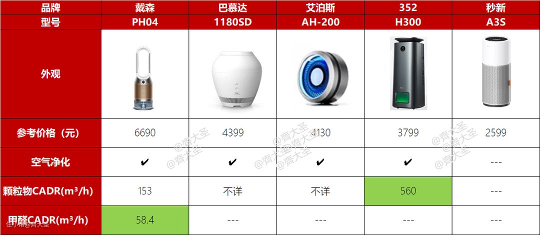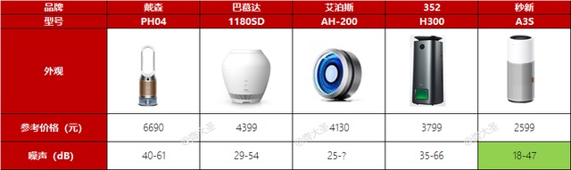 五款机型价格由高到低分别为:戴森PH04、巴慕达1180SD、艾泊斯AH-200、352 H300、秒新A3S。