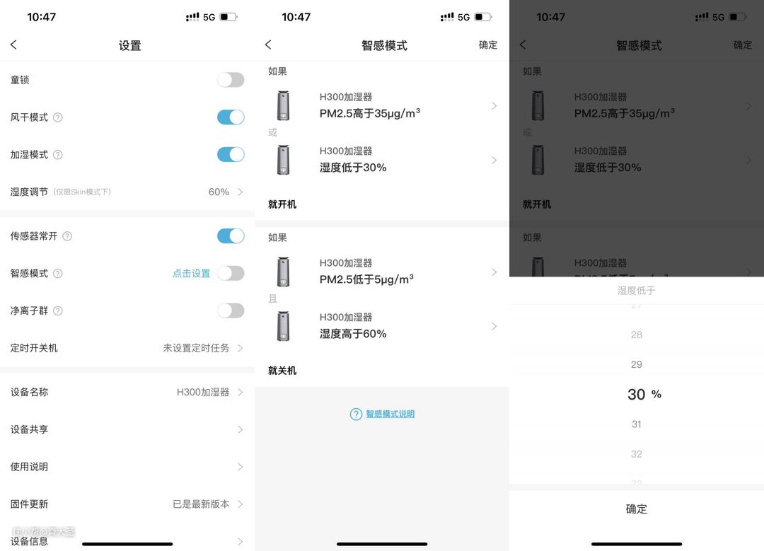 其中还有个「智感模式」值得单独讲下,其实就类似于米家的智能联动,由于机器内置温湿度传感器,因此可以设定将温/湿度作为开关机的触发条件,完成机器的自动工作,解放双手,实现无感操作。