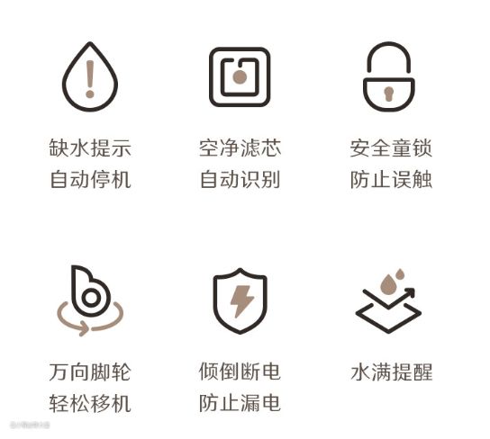 目前各机型使用的设计大概包括:童锁、缺水自动停机、溢水提醒、倾倒断电、滤芯识别等。