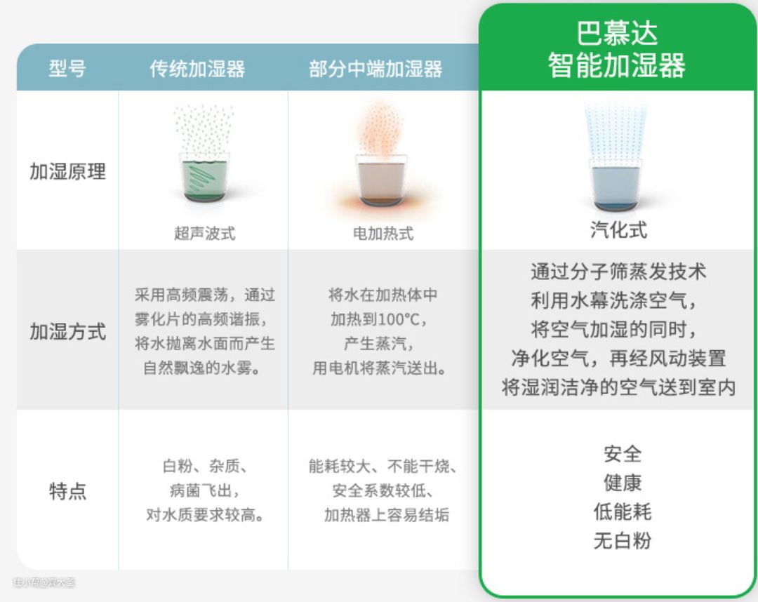 通过分子筛蒸发技术,扩大蒸发面积+加快水分子表面空气流通速度的方式提升蒸发速度从而进行加湿,类似于我们日常的水分蒸发方式,只不过通过技术手段加快了蒸发量。