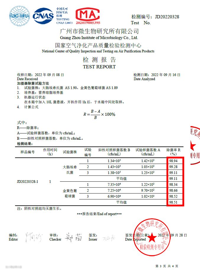 不过即便如此,我依旧对352 H300能够将加湿量做到2500ml/h有点不敢相信,毕竟2年前的艾泊斯700ml/h,一年前的秒新翻了一倍也才1400ml/h。排除虚假宣传或者搞些其它小动作,如果真能做到这个参数是真的牛。于是我特意管客服要了352 H300的检测报告,没想到还真的有,只能说技术进步的真快。