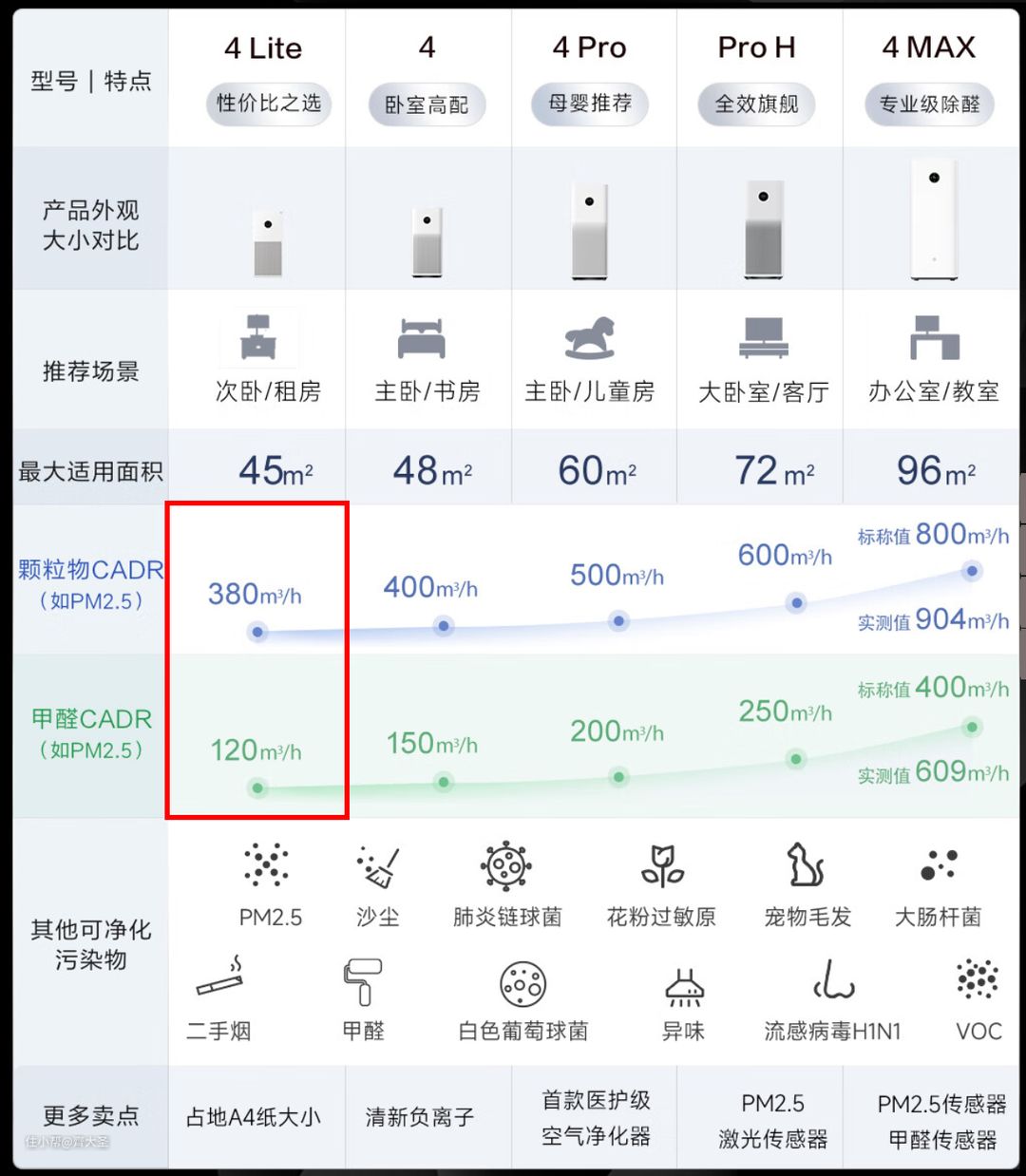 很多朋友对这个数值可能没概念,我们来个便宜的小米空气净化器lite(指导价599元)的参数看看↓