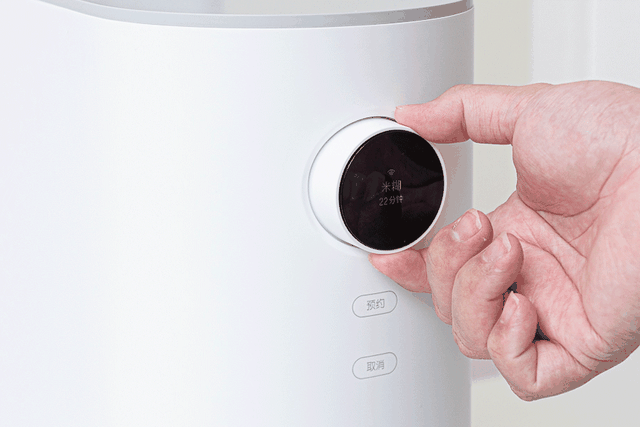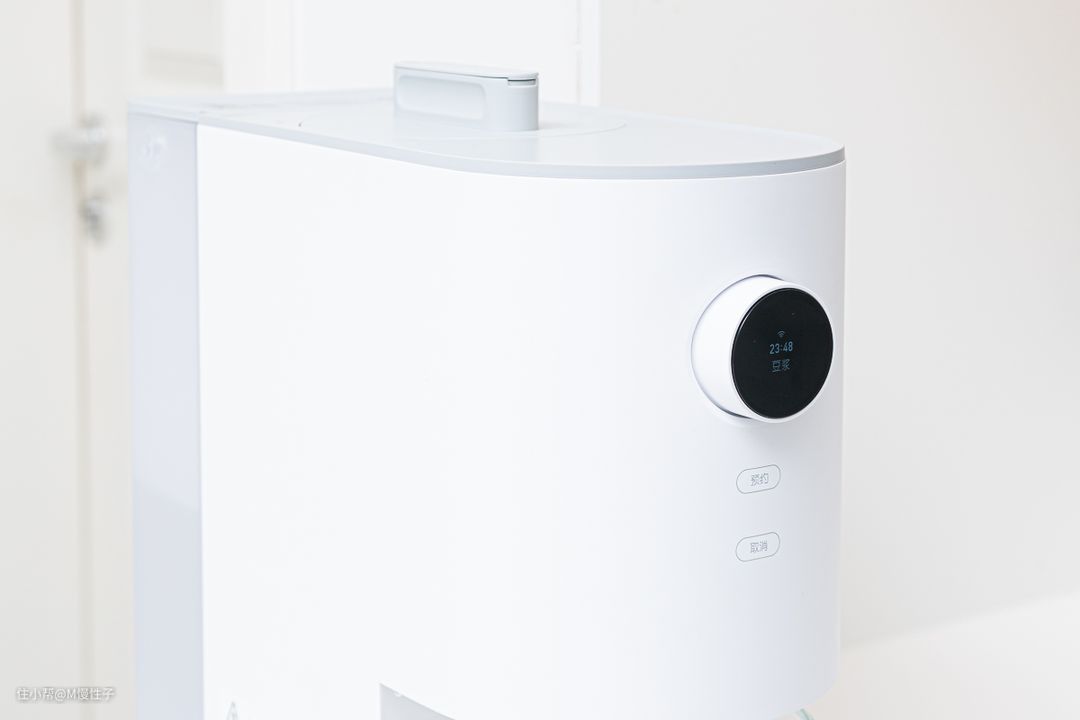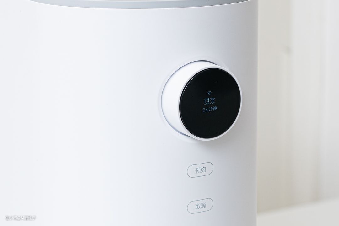 前部的旋钮集成了显示和控制部分,采用了OLED屏幕,文字清晰老年人也容易看的轻。旋钮下还有两颗触控按键,负责预约和取消,可以设置最长12小时的预约,晚上放食材早上就能喝了。
