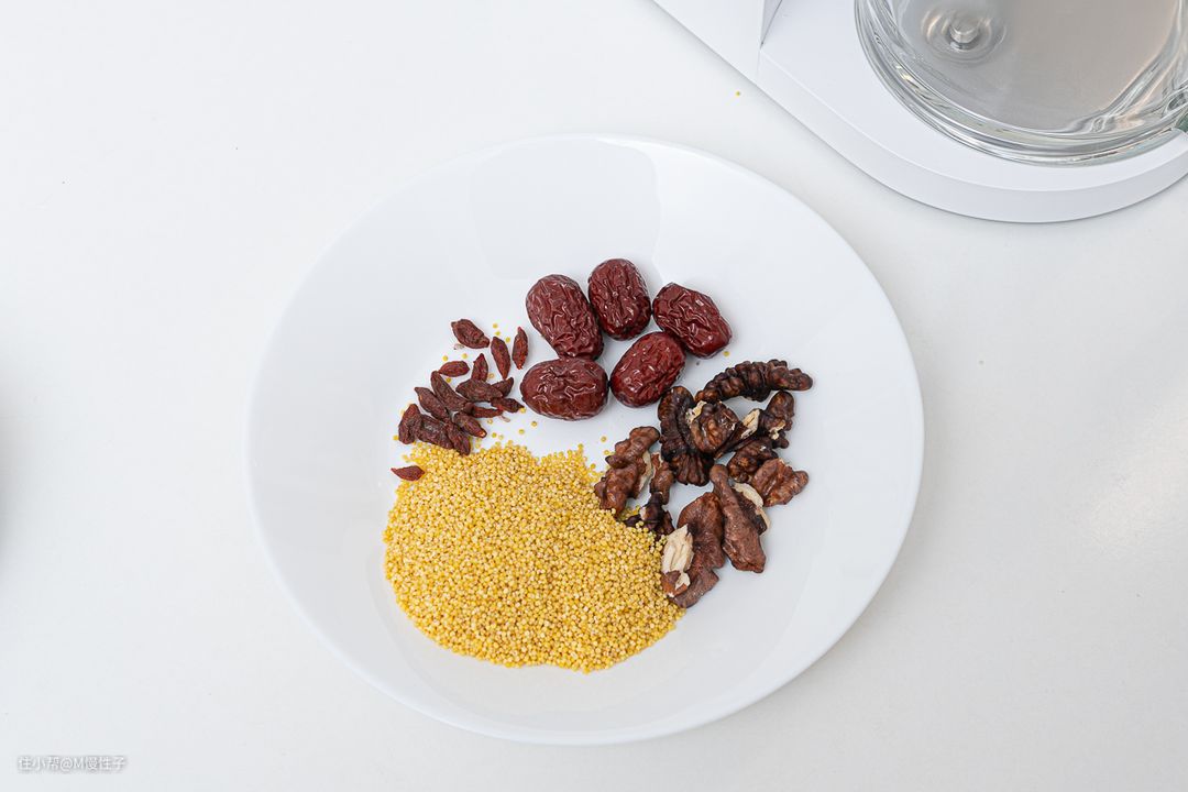 再来制作米糊吧,实用app推荐的米糊程序,按菜谱用量使用量杯称量食材,使用核桃、小米、红枣、枸杞制作营养米糊。