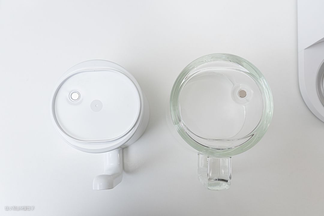 两个杯子的杯底,有设有吸铁石,杯子放入机器上后会自动识别,防止使用时拿错。