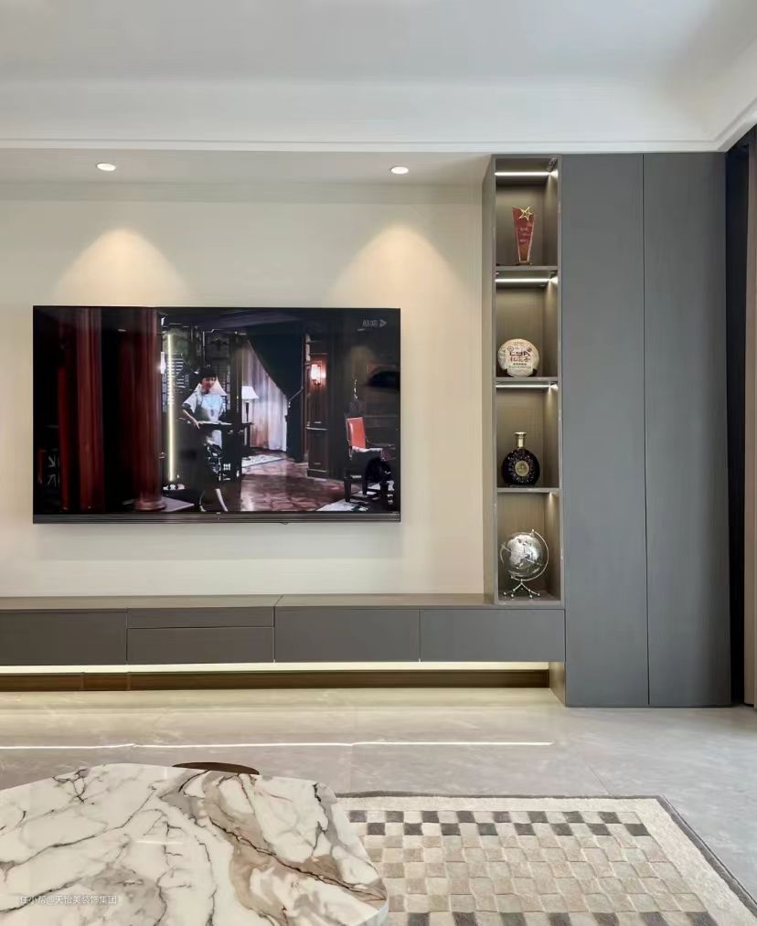 一种是密闭的玻璃柜门,同样是内嵌入隐藏灯带,用来放置饰品。玻璃柜门比开放式更容易打理,不易积灰也能防尘防风。
